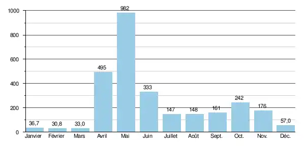 Le débit moyen mensuel observé en février (minimum d'étiage) est de 30,8 m3/s, soit 3 % du débit moyen du mois de mai (982 m3/s), ce qui souligne la forte amplitude des variations saisonnières. Et les écarts de débits mensuels peuvent être encore bien plus importants d'après les années : sur la durée d'observation de 29 ans, le débit mensuel minimal a été de 8,22 m3/s en - année de sécheresse mémorable qui fit des millions de victimes dans la Russie soviétique à ses débuts -, tandis que le débit mensuel maximal s'élevait à 1 600 m3/s en . En ce qui concerne la période libre de glace (de mai à octobre inclus), le débit minimal observé a été de 10,9 m3/s en .