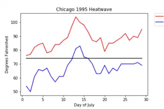 Pendant plusieurs jours la température à l'aéroport international Midway (station météorologique de Chicago) dépassa les 37 °C pour atteindre 41,1 °C avec un indice de chaleur de 52 °C créé par l'humidité inhabituelle le . La nuit les températures ont peu baissé et les indices de chaleur sont demeurés au-dessus de 40 °C. Cette vague de chaleur était d'une intensité comparable à celles que connaissent le golfe Persique ou l’Asie du sud est.