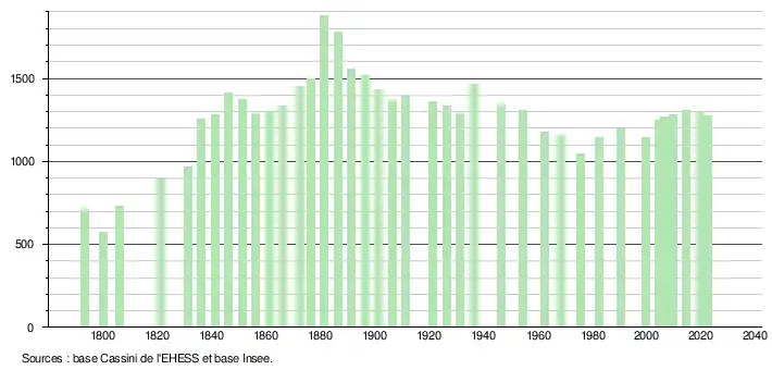 | L'évolution du nombre d'habitants est connue à travers les recensements de la population effectués dans la commune depuis 1793. Pour les communes de moins de 10 000 habitants, une enquête de recensement portant sur toute la population est réalisée tous les cinq ans, les populations de référence des années intermédiaires étant quant à elles estimées par interpolation ou extrapolation[31]. Pour la commune, le premier recensement exhaustif entrant dans le cadre du nouveau dispositif a été réalisé en 2004[32]. En 2022, la commune comptait 1 276 habitants[Note 5], en évolution de −3,7 % par rapport à 2016 (Tarn : +2,52 %, France hors Mayotte : +2,11 %). |