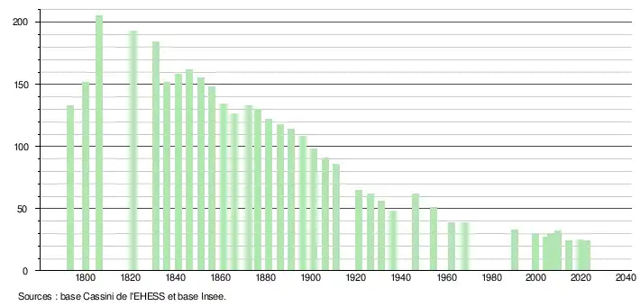 L'évolution du nombre d'habitants est connue à travers les recensements de la population effectués dans la commune depuis 1793. Pour les communes de moins de 10 000 habitants, une enquête de recensement portant sur toute la population est réalisée tous les cinq ans, les populations de référence des années intermédiaires étant quant à elles estimées par interpolation ou extrapolation[15]. Pour la commune, le premier recensement exhaustif entrant dans le cadre du nouveau dispositif a été réalisé en 2004[16].