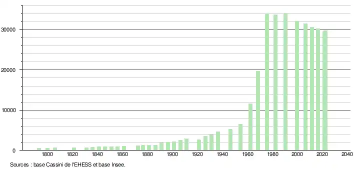 - ↑ Par convention dans Wikipédia, le principe a été retenu de n’afficher dans le tableau des recensements et le graphique, pour les populations de référence postérieures à 1999, que les populations correspondant à une enquête exhaustive de recensement pour les communes de moins de 10 000 habitants, et que les populations des années 2006, 2011, 2016, etc. pour les communes de plus de 10 000 habitants, ainsi que la dernière population de référence publiée par l’Insee pour l'ensemble des communes.