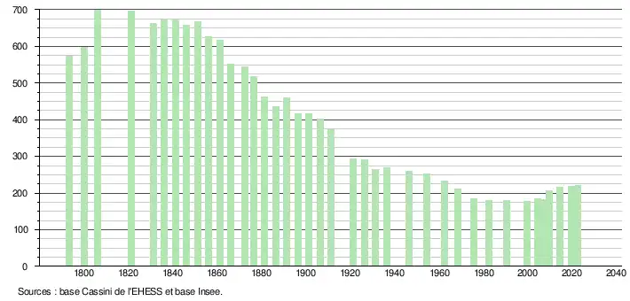 L'évolution du nombre d'habitants est connue à travers les recensements de la population effectués dans la commune depuis 1793. Pour les communes de moins de 10 000 habitants, une enquête de recensement portant sur toute la population est réalisée tous les cinq ans, les populations de référence des années intermédiaires étant quant à elles estimées par interpolation ou extrapolation[30]. Pour la commune, le premier recensement exhaustif entrant dans le cadre du nouveau dispositif a été réalisé en 2004[31].