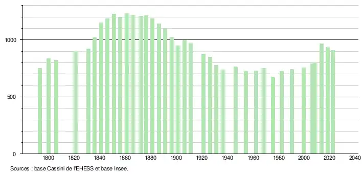 L'évolution du nombre d'habitants est connue à travers les recensements de la population effectués dans la commune depuis 1793. Pour les communes de moins de 10 000 habitants, une enquête de recensement portant sur toute la population est réalisée tous les cinq ans, les populations de référence des années intermédiaires étant quant à elles estimées par interpolation ou extrapolation[13]. Pour la commune, le premier recensement exhaustif entrant dans le cadre du nouveau dispositif a été réalisé en 2008[14].