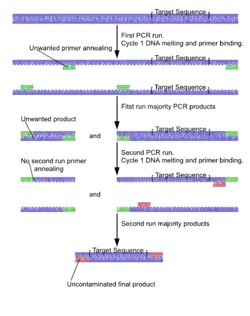 La PCR imbriquée est utilisée pour augmenter la spécificité de l'amplification de l'ADN. Deux jeux d'amorces sont utilisés dans deux réactions successives. Dans la première PCR, une paire d'amorces est utilisée pour générer des produits d'ADN, qui peuvent contenir des produits amplifiés à partir de zones non cibles. Les produits de la première PCR sont ensuite utilisés comme modèle dans une deuxième PCR, en utilisant une amorce ("hémi-imbrication") ou deux amorces différentes dont les sites de liaison sont localisés (imbriqués) dans le premier ensemble, augmentant ainsi la spécificité. La PCR imbriquée réussit souvent mieux à amplifier spécifiquement les produits d'ADN longs que la PCR conventionnelle, mais elle nécessite une connaissance plus détaillée de la séquence de la cible.