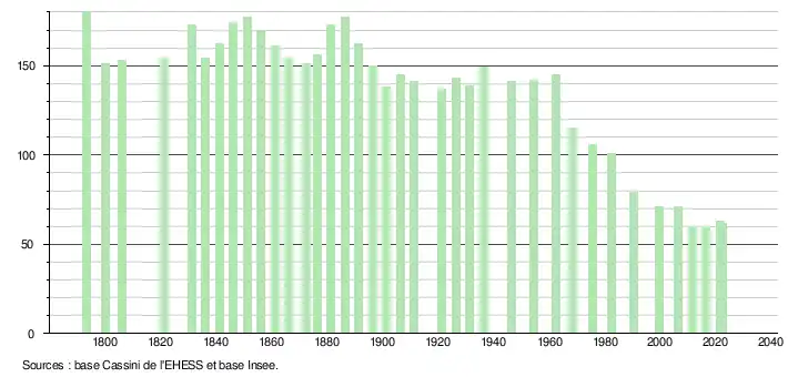 L'évolution du nombre d'habitants est connue à travers les recensements de la population effectués dans la commune depuis 1793. Pour les communes de moins de 10 000 habitants, une enquête de recensement portant sur toute la population est réalisée tous les cinq ans, les populations de référence des années intermédiaires étant quant à elles estimées par interpolation ou extrapolation[27]. Pour la commune, le premier recensement exhaustif entrant dans le cadre du nouveau dispositif a été réalisé en 2006[28].