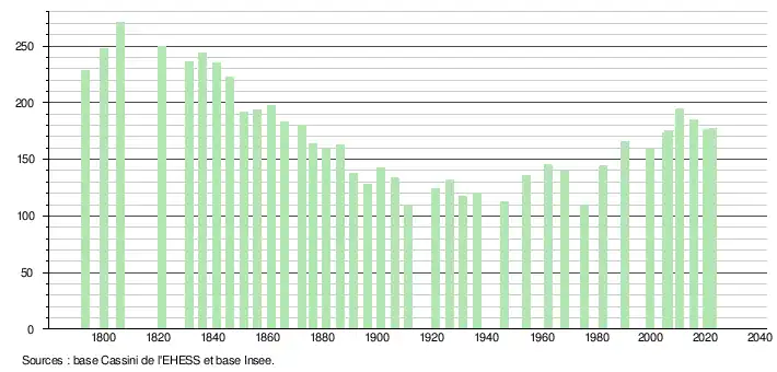 | L'évolution du nombre d'habitants est connue à travers les recensements de la population effectués dans la commune depuis 1793. Pour les communes de moins de 10 000 habitants, une enquête de recensement portant sur toute la population est réalisée tous les cinq ans, les populations de référence des années intermédiaires étant quant à elles estimées par interpolation ou extrapolation[24]. Pour la commune, le premier recensement exhaustif entrant dans le cadre du nouveau dispositif a été réalisé en 2005[25]. En 2022, la commune comptait 177 habitants[Note 4], en évolution de −3,28 % par rapport à 2016 (Eure : −0,25 %, France hors Mayotte : +2,11 %). |