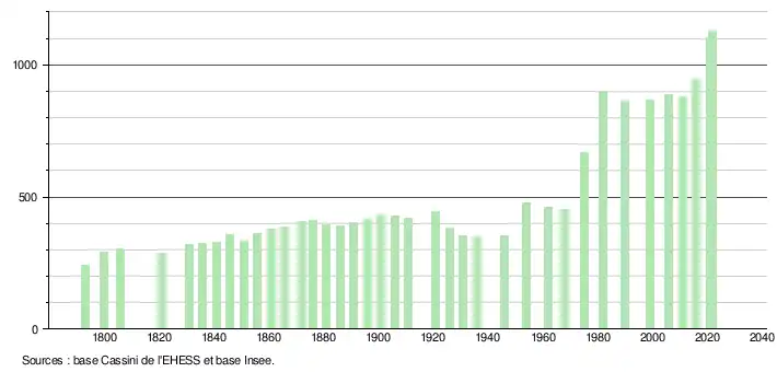 L'évolution du nombre d'habitants est connue à travers les recensements de la population effectués dans la commune depuis 1793. Pour les communes de moins de 10 000 habitants, une enquête de recensement portant sur toute la population est réalisée tous les cinq ans, les populations de référence des années intermédiaires étant quant à elles estimées par interpolation ou extrapolation[27]. Pour la commune, le premier recensement exhaustif entrant dans le cadre du nouveau dispositif a été réalisé en 2006[28].