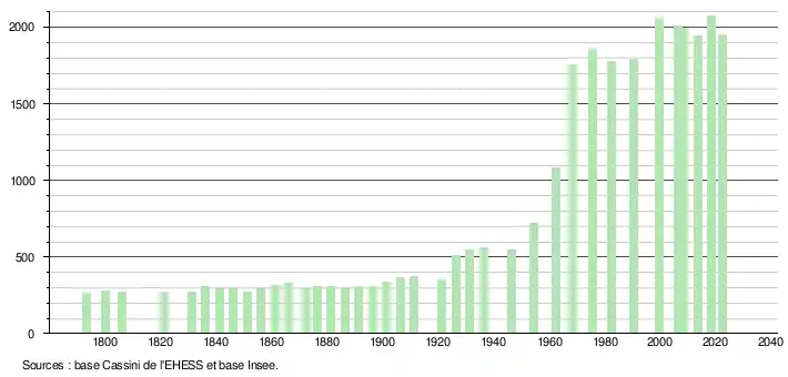 L'évolution du nombre d'habitants est connue à travers les recensements de la population effectués dans la commune depuis 1793. Pour les communes de moins de 10 000 habitants, une enquête de recensement portant sur toute la population est réalisée tous les cinq ans, les populations de référence des années intermédiaires étant quant à elles estimées par interpolation ou extrapolation[32]. Pour la commune, le premier recensement exhaustif entrant dans le cadre du nouveau dispositif a été réalisé en 2008[33].