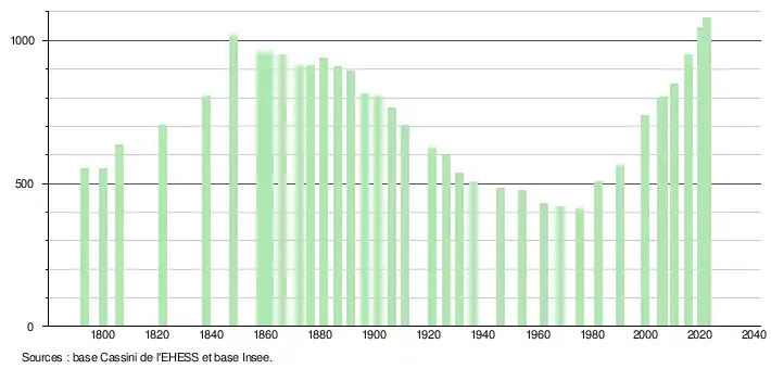 L'évolution du nombre d'habitants est connue à travers les recensements de la population effectués dans la commune depuis 1793. Pour les communes de moins de 10 000 habitants, une enquête de recensement portant sur toute la population est réalisée tous les cinq ans, les populations de référence des années intermédiaires étant quant à elles estimées par interpolation ou extrapolation[9]. Pour la commune, le premier recensement exhaustif entrant dans le cadre du nouveau dispositif a été réalisé en 2005[10].