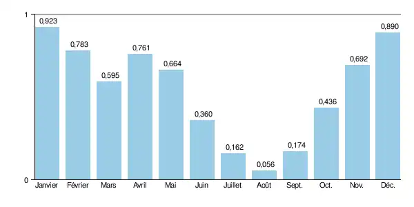 Les crues, quant à elles, peuvent être importantes, compte tenu de la taille modeste de la rivière et de son bassin versant. Les QIX 2 et QIX 5 valent respectivement 15 et 22 m3/s. Le QIX 10 est de 27 m3 et le QIX 20 de 31 m3/s, tandis que le QIX 50 n'a pas été calculé étant donné l'insuffisance de la durée d'observation des débits[2].