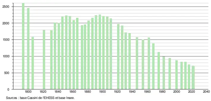 L'évolution du nombre d'habitants est connue à travers les recensements de la population effectués dans la commune depuis 1793. Pour les communes de moins de 10 000 habitants, une enquête de recensement portant sur toute la population est réalisée tous les cinq ans, les populations de référence des années intermédiaires étant quant à elles estimées par interpolation ou extrapolation[19]. Pour la commune, le premier recensement exhaustif entrant dans le cadre du nouveau dispositif a été réalisé en 2006[20].