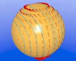Le champ de vecteurs suivant l'expression K=sin⁡ϕeθ+cot⁡θcos⁡ϕeϕ et ses lignes intégrales crées avec POVRAY.