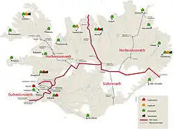 - ↑ http://www.vegagerdin.is/english/road-conditions-and-weather/the-entire-country/island1e.html La carte des routes ouvertes en temps réel (en anglais).
