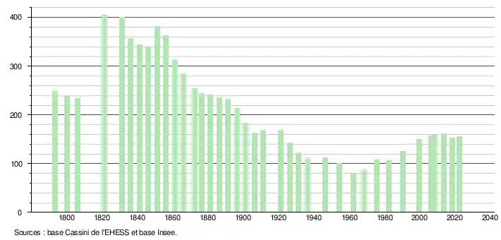 L'évolution du nombre d'habitants est connue à travers les recensements de la population effectués dans la commune depuis 1793. Pour les communes de moins de 10 000 habitants, une enquête de recensement portant sur toute la population est réalisée tous les cinq ans, les populations de référence des années intermédiaires étant quant à elles estimées par interpolation ou extrapolation[18]. Pour la commune, le premier recensement exhaustif entrant dans le cadre du nouveau dispositif a été réalisé en 2008[19].
