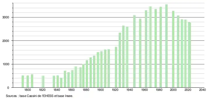 L'évolution du nombre d'habitants est connue à travers les recensements de la population effectués dans la commune depuis 1793. Pour les communes de moins de 10 000 habitants, une enquête de recensement portant sur toute la population est réalisée tous les cinq ans, les populations de référence des années intermédiaires étant quant à elles estimées par interpolation ou extrapolation[22]. Pour la commune, le premier recensement exhaustif entrant dans le cadre du nouveau dispositif a été réalisé en 2006[23].
