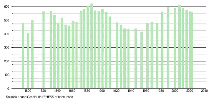 L'évolution du nombre d'habitants est connue à travers les recensements de la population effectués dans la commune depuis 1793. Pour les communes de moins de 10 000 habitants, une enquête de recensement portant sur toute la population est réalisée tous les cinq ans, les populations de référence des années intermédiaires étant quant à elles estimées par interpolation ou extrapolation[14]. Pour la commune, le premier recensement exhaustif entrant dans le cadre du nouveau dispositif a été réalisé en 2005[15].