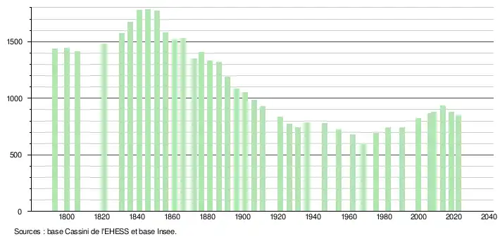 L'évolution du nombre d'habitants est connue à travers les recensements de la population effectués dans la commune depuis 1793. Pour les communes de moins de 10 000 habitants, une enquête de recensement portant sur toute la population est réalisée tous les cinq ans, les populations de référence des années intermédiaires étant quant à elles estimées par interpolation ou extrapolation[16]. Pour la commune, le premier recensement exhaustif entrant dans le cadre du nouveau dispositif a été réalisé en 2008[17].