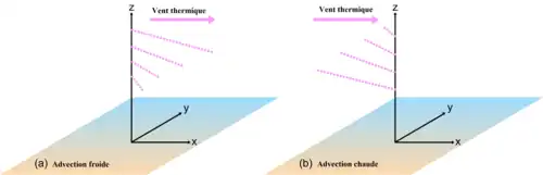 Si le vent géostrophique tourne avec l'altitude, il transporte de l'air d'une certaine température depuis une zone vers une autre qui a une température différente. Il s'agit d'advection chaude ou froide selon le cas. Ceci change la distribution thermique et naturellement crée un vent thermique.