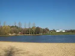 La place de l'église, la plage de l'étang, pont de Vaugon sur la Seiche .