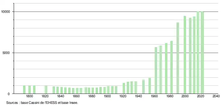 - ↑ Par convention dans Wikipédia, le principe a été retenu de n’afficher dans le tableau des recensements et le graphique, pour les populations de référence postérieures à 1999, que les populations correspondant à une enquête exhaustive de recensement pour les communes de moins de 10 000 habitants, et que les populations des années 2006, 2011, 2016, etc. pour les communes de plus de 10 000 habitants, ainsi que la dernière population de référence publiée par l’Insee pour l'ensemble des communes.