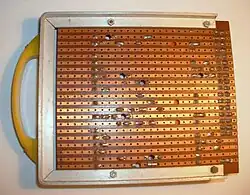 Acheté en plaques de 1,6 mm cuivré, le circuit imprimé a été coupé pour donner des planches d'une taille de 122 × 456 mm puis usiné pour former le produit final selon la spécification originale de Veroboard. Un outil multiple fraiseuse, qui comprend une banque de fraises de côté-et-face avec les dents de coupe de forme adéquate, a été fabriqué puis utilisé pour retirer une partie du cuivre collé sur chaque carte, laissant 21 bandes conductrices[5]. Pour une deuxième opération, un outil spécial avec 63 punch bits durcis de 1,35 mm de diamètre, monté sur un bloc de base solide a été construit pour répéter et poinçonner une matrice de trous, d'un espacement de 5,0 mm, à travers les bandes de cuivre et le substrat.