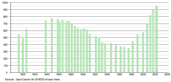 L'évolution du nombre d'habitants est connue à travers les recensements de la population effectués dans la commune depuis 1793. Pour les communes de moins de 10 000 habitants, une enquête de recensement portant sur toute la population est réalisée tous les cinq ans, les populations de référence des années intermédiaires étant quant à elles estimées par interpolation ou extrapolation[8]. Pour la commune, le premier recensement exhaustif entrant dans le cadre du nouveau dispositif a été réalisé en 2006[9].