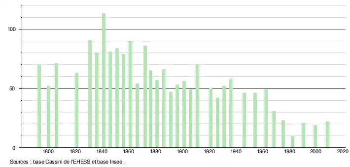- ↑ Par convention dans Wikipédia, le principe a été retenu de n’afficher dans le tableau des recensements et le graphique, pour les populations légales postérieures à 1999, que les populations correspondant à une enquête exhaustive de recensement pour les communes de moins de 10 000 habitants, et que les populations des années 2006, 2011, 2016, etc. pour les communes de plus de 10 000 habitants, ainsi que la dernière population légale publiée par l’Insee pour l'ensemble des communes.