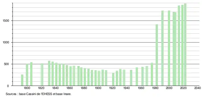 L'évolution du nombre d'habitants est connue à travers les recensements de la population effectués dans la commune depuis 1793. Pour les communes de moins de 10 000 habitants, une enquête de recensement portant sur toute la population est réalisée tous les cinq ans, les populations de référence des années intermédiaires étant quant à elles estimées par interpolation ou extrapolation[19]. Pour la commune, le premier recensement exhaustif entrant dans le cadre du nouveau dispositif a été réalisé en 2008[20].
