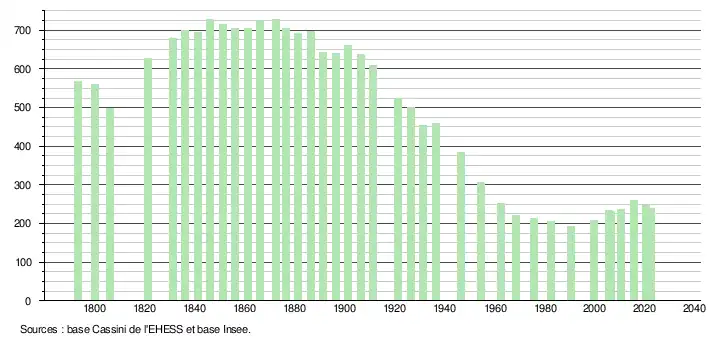 | L'évolution du nombre d'habitants est connue à travers les recensements de la population effectués dans la commune depuis 1793. Pour les communes de moins de 10 000 habitants, une enquête de recensement portant sur toute la population est réalisée tous les cinq ans, les populations de référence des années intermédiaires étant quant à elles estimées par interpolation ou extrapolation[23]. Pour la commune, le premier recensement exhaustif entrant dans le cadre du nouveau dispositif a été réalisé en 2005[24]. En 2022, la commune comptait 238 habitants[Note 2], en évolution de −10,53 % par rapport à 2016 (Landes : +5,78 %, France hors Mayotte : +2,11 %). |