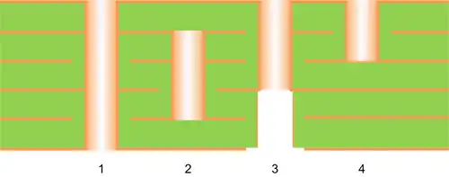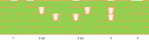 - Vias avec perçage contrôlé en profondeur (Controlled Depth Drilling), équivalents à des microvia