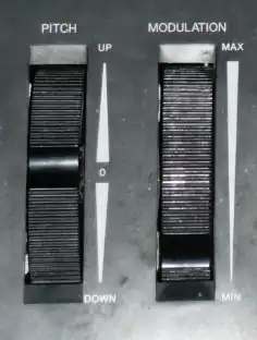 Une molette (pitch bend) permet de changer la hauteur d'une note à la main sur un synthétiseur (à gauche).