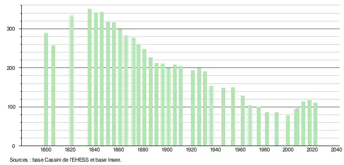 L'évolution du nombre d'habitants est connue à travers les recensements de la population effectués dans la commune depuis 1800. Pour les communes de moins de 10 000 habitants, une enquête de recensement portant sur toute la population est réalisée tous les cinq ans, les populations de référence des années intermédiaires étant quant à elles estimées par interpolation ou extrapolation[12]. Pour la commune, le premier recensement exhaustif entrant dans le cadre du nouveau dispositif a été réalisé en 2007[13].