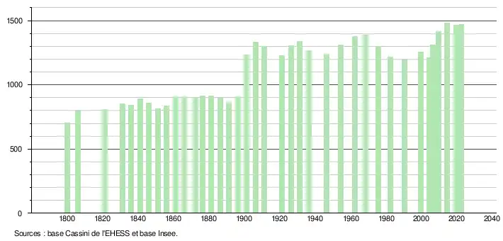 L'évolution du nombre d'habitants est connue à travers les recensements de la population effectués dans la commune depuis 1800. Pour les communes de moins de 10 000 habitants, une enquête de recensement portant sur toute la population est réalisée tous les cinq ans, les populations de référence des années intermédiaires étant quant à elles estimées par interpolation ou extrapolation[29]. Pour la commune, le premier recensement exhaustif entrant dans le cadre du nouveau dispositif a été réalisé en 2004[30].