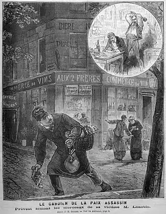 « Depuis un certain temps je connaissais M. Lenoble, auquel j'avais manifesté l'intention d'acheter une chaîne en or payable par acomptes. Nous avons pris rendez-vous et hier, à midi, il était dans ma chambre, rue Riquet, no 75. Sur mon lit, il étala ses marchandises et moyennant le prix débattu et fixé à 240 francs, il me confia sa plus belle chaîne et son plus beau médaillon. J'ai profité du moment où il libellait les billets payables par termes mensuels et que je devais lui signer pour l'assommer avec une boule de tender[Note 5]. Un premier coup vigoureux, lancé à deux mains l'abattit ; le second coup défonça le crâne: le troisième était inutile. Il ne fit aucun mouvement, ne poussa pas un cri, seul un léger filet rouge se montra entre ses lèvres. J'ouvris la gorge et sous la plaie béante j'ai placé le vase nécessaire à recevoir le sang. Il sortit en glouglous à des intervalles espacés. Je déshabillais ensuite ma victime, je l'étendis sur une malle et je l'écorchais entièrement afin d'empêcher la reconnaissance des chairs. À trois heures j'ai commencé le dépeçage du cadavre et à cinq heures ma besogne était terminée. Les cabinets d'aisance contiennent la partie liquide et c'est dans les égouts et les terrains vagues, les fossés des fortifications que j'ai semé les parties solides. Ma tournée faite, j'ai soupé, et à dix heures je me suis couché. Ce matin j'ai repris mon service en laissant chez moi la tête de Lenoble, sa boite à bijoux et ses vêtements[26]. »