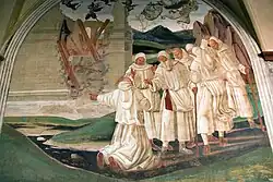 ![]() | 12 | Benoît reçoit deux jeunes Romains, Maur et Placide | La renommée de Benoît commence à grandir et « les citoyens de Rome, distingués par leur naissance et leur piété, vinrent le visiter en foule, et lui offrirent leurs enfants pour les élever dans la crainte du Seigneur. Eutyche lui présenta Maur, et le patrice Tertulle, son fils Placide »[14]. Les deux jeunes vont devenir d'importants collaborateurs de Benoît. Ils se présentent accompagnés de leurs pères et d'une escorte impressionnante, que l'on voit quitter Rome (à l'arrière-plan), entrer dans Subiaco (au second plan) et occuper en désordre le premier plan. Cette fresque animée et débordante de personnages inclut des portraits frappants, et certains y ont reconnu ceux de Signorelli et de Fra Angelico. |
