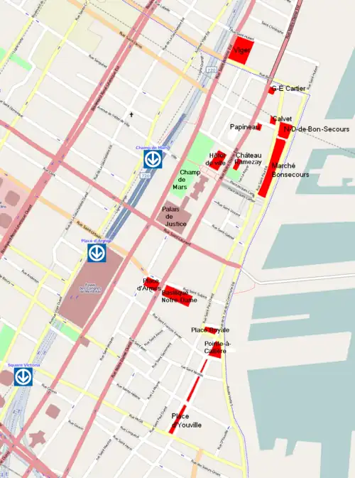 On y trouve plusieurs places publiques d'importance (Place d'Armes, Place Jacques-Cartier) ainsi que la très visitée Basilique Notre-Dame de Montréal qui reçoit durant l'été plus de 2500 visiteurs par jour[11].