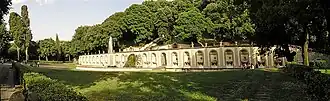 Plusieurs escaliers, entourés de colonnades en partie abîmées, conduisent à une terrasse plus élevée où, parmi les bosquets d'ilex et de chênes, se trouvent de petits sentiers conduisant vers un grand jet d'eau qui arrose un bassin mi-circulaire, dessiné par Domenico Fontana.