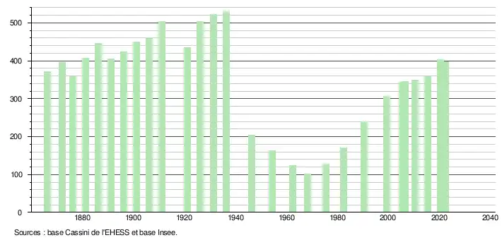 L'évolution du nombre d'habitants est connue à travers les recensements de la population effectués dans la commune depuis 1866. Pour les communes de moins de 10 000 habitants, une enquête de recensement portant sur toute la population est réalisée tous les cinq ans, les populations de référence des années intermédiaires étant quant à elles estimées par interpolation ou extrapolation[10]. Pour la commune, le premier recensement exhaustif entrant dans le cadre du nouveau dispositif a été réalisé en 2005[11].