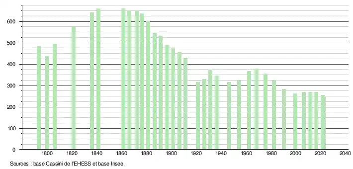 L'évolution du nombre d'habitants est connue à travers les recensements de la population effectués dans la commune depuis 1793. Pour les communes de moins de 10 000 habitants, une enquête de recensement portant sur toute la population est réalisée tous les cinq ans, les populations de référence des années intermédiaires étant quant à elles estimées par interpolation ou extrapolation[20]. Pour la commune, le premier recensement exhaustif entrant dans le cadre du nouveau dispositif a été réalisé en 2006[21].