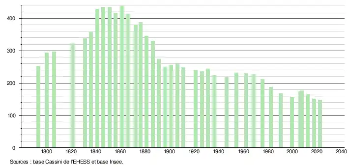 L'évolution du nombre d'habitants est connue à travers les recensements de la population effectués dans la commune depuis 1793. Pour les communes de moins de 10 000 habitants, une enquête de recensement portant sur toute la population est réalisée tous les cinq ans, les populations de référence des années intermédiaires étant quant à elles estimées par interpolation ou extrapolation[15]. Pour la commune, le premier recensement exhaustif entrant dans le cadre du nouveau dispositif a été réalisé en 2007[16].