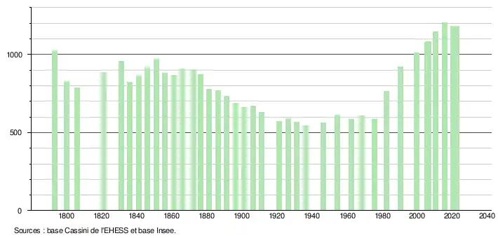 L'évolution du nombre d'habitants est connue à travers les recensements de la population effectués dans la commune depuis 1793. Pour les communes de moins de 10 000 habitants, une enquête de recensement portant sur toute la population est réalisée tous les cinq ans, les populations de référence des années intermédiaires étant quant à elles estimées par interpolation ou extrapolation[17]. Pour la commune, le premier recensement exhaustif entrant dans le cadre du nouveau dispositif a été réalisé en 2005[18].
