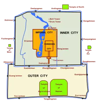 - Zhengyangmen (正阳门), porte du Midi, également appelée Qianmen (前门), porte Avant ;