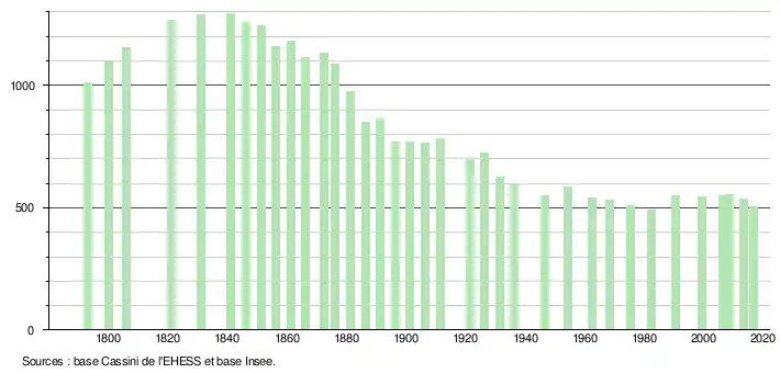 L'évolution du nombre d'habitants est connue à travers les recensements de la population effectués dans la commune depuis 1793. Pour les communes de moins de 10 000 habitants, une enquête de recensement portant sur toute la population est réalisée tous les cinq ans, les populations de référence des années intermédiaires étant quant à elles estimées par interpolation ou extrapolation[18]. Pour la commune, le premier recensement exhaustif entrant dans le cadre du nouveau dispositif a été réalisé en 2008[19].