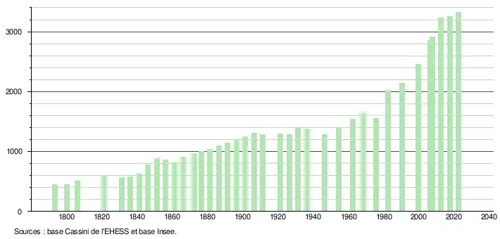 L'évolution du nombre d'habitants est connue à travers les recensements de la population effectués dans la commune depuis 1793. Pour les communes de moins de 10 000 habitants, une enquête de recensement portant sur toute la population est réalisée tous les cinq ans, les populations de référence des années intermédiaires étant quant à elles estimées par interpolation ou extrapolation[30]. Pour la commune, le premier recensement exhaustif entrant dans le cadre du nouveau dispositif a été réalisé en 2007[31].
