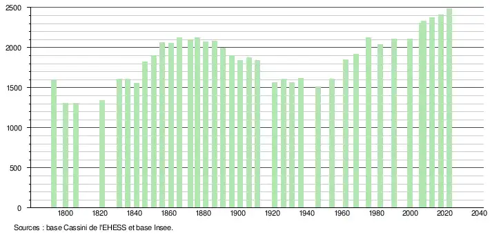 L'évolution du nombre d'habitants est connue à travers les recensements de la population effectués dans la commune depuis 1793. Pour les communes de moins de 10 000 habitants, une enquête de recensement portant sur toute la population est réalisée tous les cinq ans, les populations de référence des années intermédiaires étant quant à elles estimées par interpolation ou extrapolation[25]. Pour la commune, le premier recensement exhaustif entrant dans le cadre du nouveau dispositif a été réalisé en 2007[26].