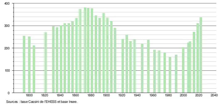 L'évolution du nombre d'habitants est connue à travers les recensements de la population effectués dans la commune depuis 1793. Pour les communes de moins de 10 000 habitants, une enquête de recensement portant sur toute la population est réalisée tous les cinq ans, les populations de référence des années intermédiaires étant quant à elles estimées par interpolation ou extrapolation[14]. Pour la commune, le premier recensement exhaustif entrant dans le cadre du nouveau dispositif a été réalisé en 2008[15].