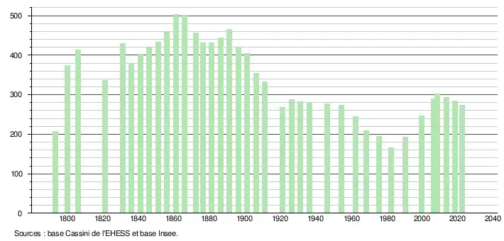 L'évolution du nombre d'habitants est connue à travers les recensements de la population effectués dans la commune depuis 1793. Pour les communes de moins de 10 000 habitants, une enquête de recensement portant sur toute la population est réalisée tous les cinq ans, les populations de référence des années intermédiaires étant quant à elles estimées par interpolation ou extrapolation[19]. Pour la commune, le premier recensement exhaustif entrant dans le cadre du nouveau dispositif a été réalisé en 2008[20].