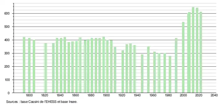 - ↑ Fiches Insee - Populations de référence de la commune pour les années 2006, 2007, 2008, 2009, 2010, 2011, 2012, 2013, 2014, 2015, 2016, 2017, 2018, 2019, 2020, 2021 et 2022.
