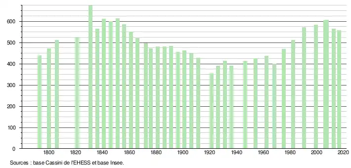 L'évolution du nombre d'habitants est connue à travers les recensements de la population effectués dans la commune depuis 1793. Pour les communes de moins de 10 000 habitants, une enquête de recensement portant sur toute la population est réalisée tous les cinq ans, les populations de référence des années intermédiaires étant quant à elles estimées par interpolation ou extrapolation[24]. Pour la commune, le premier recensement exhaustif entrant dans le cadre du nouveau dispositif a été réalisé en 2007[25].