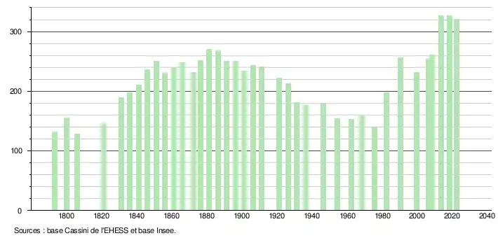 L'évolution du nombre d'habitants est connue à travers les recensements de la population effectués dans la commune depuis 1793. Pour les communes de moins de 10 000 habitants, une enquête de recensement portant sur toute la population est réalisée tous les cinq ans, les populations de référence des années intermédiaires étant quant à elles estimées par interpolation ou extrapolation[34]. Pour la commune, le premier recensement exhaustif entrant dans le cadre du nouveau dispositif a été réalisé en 2008[35].